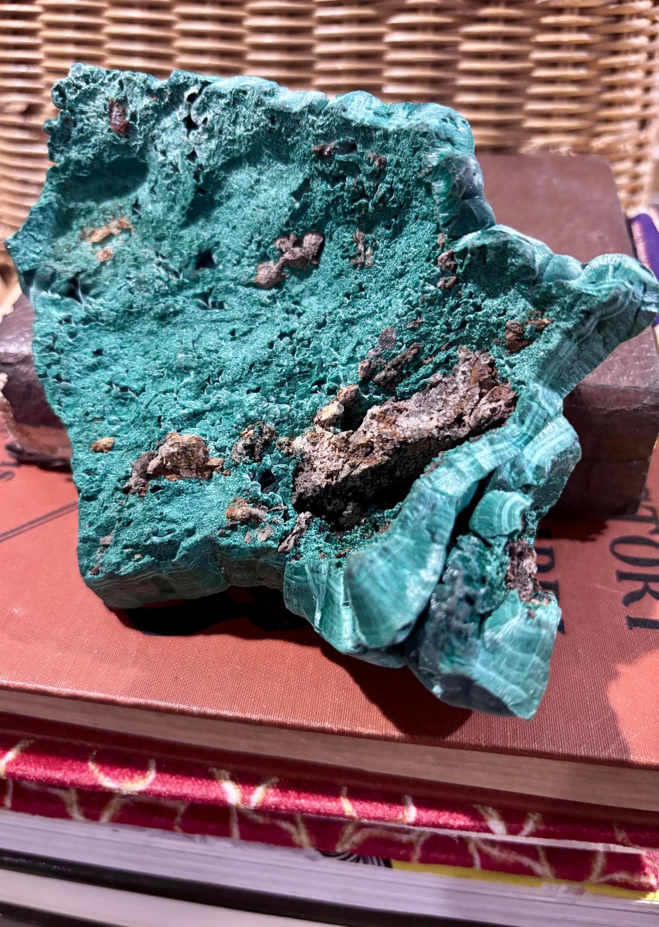 Velvety and bold, this 498g botryoidal malachite is a true conversation piece. Rich forest green with pillowy texture, it looks almost fluid—like it’s still forming. Mounted on a display stand, it’s a natural sculpture that draws the eye.