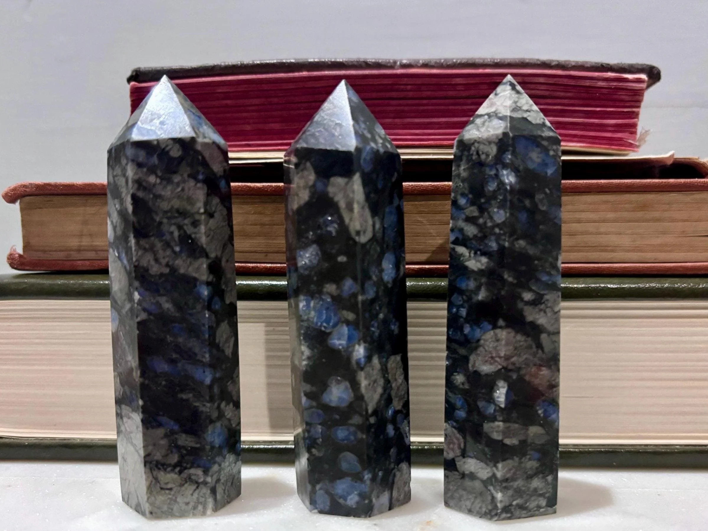 Also known as Indigo Gabbro, these polished towers have a deep black base swirled with stormy grays and flashes of indigo. Each one is full of bold, moody energy and completely unique in its natural patterning.